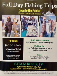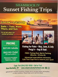 Public Fishing – Sunset Fishing Trips (Beginning May 22, 2026) Departing at 5pm sharp and return around 9pm Sailing every evening Except Monday! The Schedule does change sometimes – Trips are added or sometimes sold out- call or text for latest week to week updates. Also check our FB or Instagram Page for latest updates. This is available as Public or even Private Rental. All are welcome to join. Just contact Capt. Pat to reserve and pay for your spots at 914-552-3050. Fishing for Fluke or Porgy’s Depending on what will give us best chance for success.