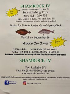 Public Fishing –  Sunset Fishing Trips (Beginning May 25, 2025) Departing at 5pm sharp and return around 9pm Sailing When available on Tues. Weds. Thurs. & Sunday’s. The Schedule does change sometimes – Trips are added or sometimes sold out- call or text for latest weekly updates. Also check our FB Page for latest updates.  This is available as public and all are welcome to join. Just contact Capt. Pat to reserve and pay for your spots at 914-552-3050. Fishing for Fluke or Porgy’s Depending on what will give us best chance for success.
